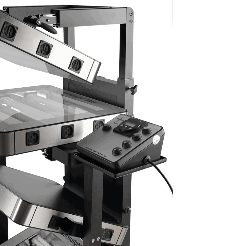 Das modular aufgebaute dermalight®500R-1 bis -4 ermöglicht maximale Flexibilität bei der Teilkörperbestrahlung für unterschiedliche Körperbereiche wie zum Beispiel Hände, Füsse, Brust, Steiss, Knie, Gesicht oder Beine. Eine Modulerweiterung ist problemlos möglich und das höhenverstellbare Stativ ermöglicht eine gleichzeitige Behandlung von Händen und Füssen in bequemer Sitzposition sowie weitere Teilkörper-Anwendungen. Der externe Steuerkasten, positioniert in einer Schublade in der Mitte des Produktes, ermöglicht eine komfortable und exakte Einstellung der Behandlungszeit. Die Strahler schalten hier automatisch nach Ablauf der gewählten Behandlungszeit ab.