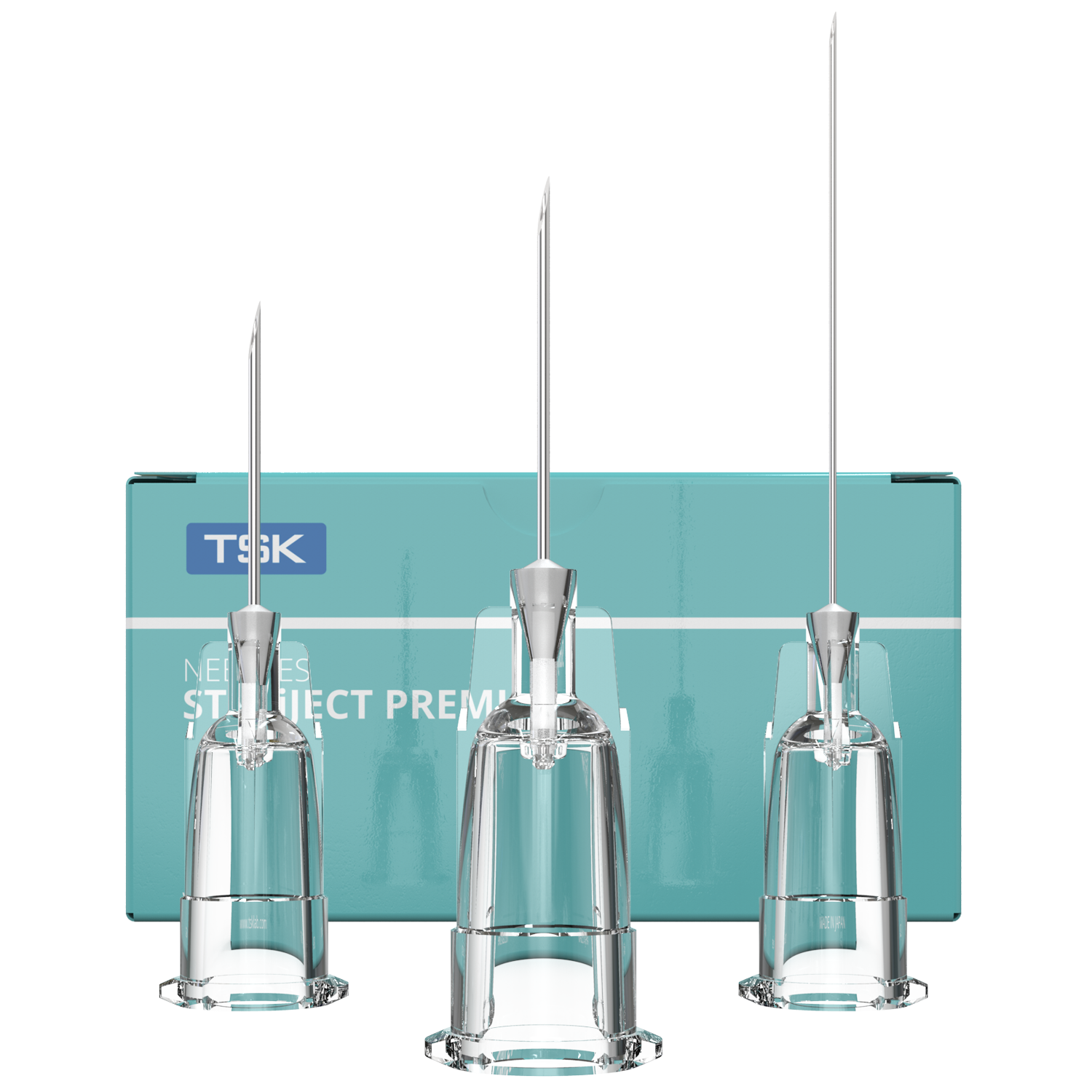 PRC-Nadeln werden mit TSKiD™ Large-Zylindern geliefert. TSK hat spezielle TSKiD™-Nadelhülsen entwickelt, die einen vergrösserten Innendurchmesser haben. Die TSKiD™-Technologie unterscheidet zwischen TSKiD™ Standard, Large und Max. Bei TSKiD™ Max vergrössert sich der Innendurchmesser einer 30-G-Nadel im Vergleich zur ISO-Norm um bis zu 65 %. Abbildung: (von links nach rechts); TSKiD™ Max, TSKiD™ Large, TSKiD™ Standard und eine normale Hülse)